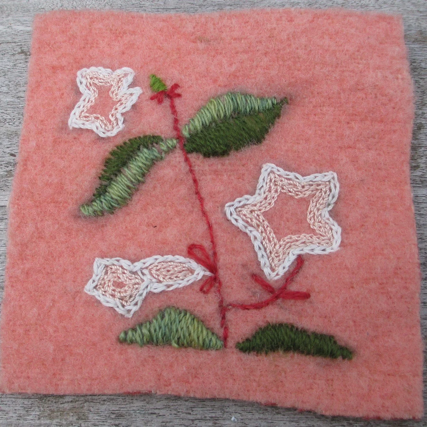 MESSAGE:I was sent a pink square and the colour made me think of a plant in our garden: abelia. It was given to us some years ago by our daughter and since then has grown into a beautiful bush which the bees love at this time of year, and it has a lovely scent.I included a little of some plant dyed yarn that I had.