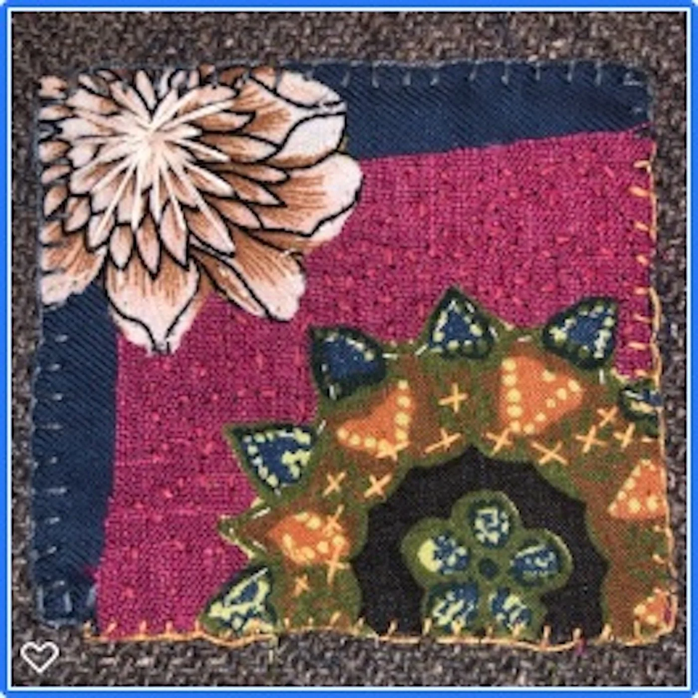 MESSAGE:I completed a simple square, looking out of my window on to the setting sun. I live on a hill and whilst stitching, I thought about others who may be looking at the same sun, but maybe not free or safe to take part in such a collaborative project. I found it hard to express what I really wanted to say so concentrated on the stitching and wrote a few lines.