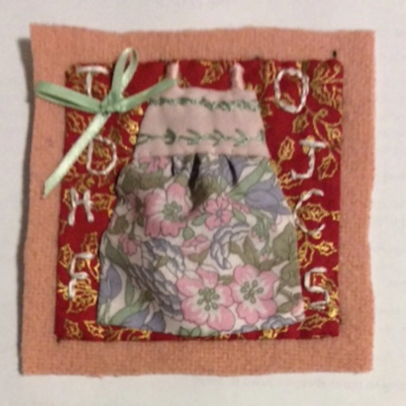 MESSAGE:My patch reminds me of my grandchildren. Their initials appear round the edge. The fabrics are from items I have sewn for them over many years, such as Christmas stockings and summer dresses. My hopes and prayers for them are sewn into this patch.