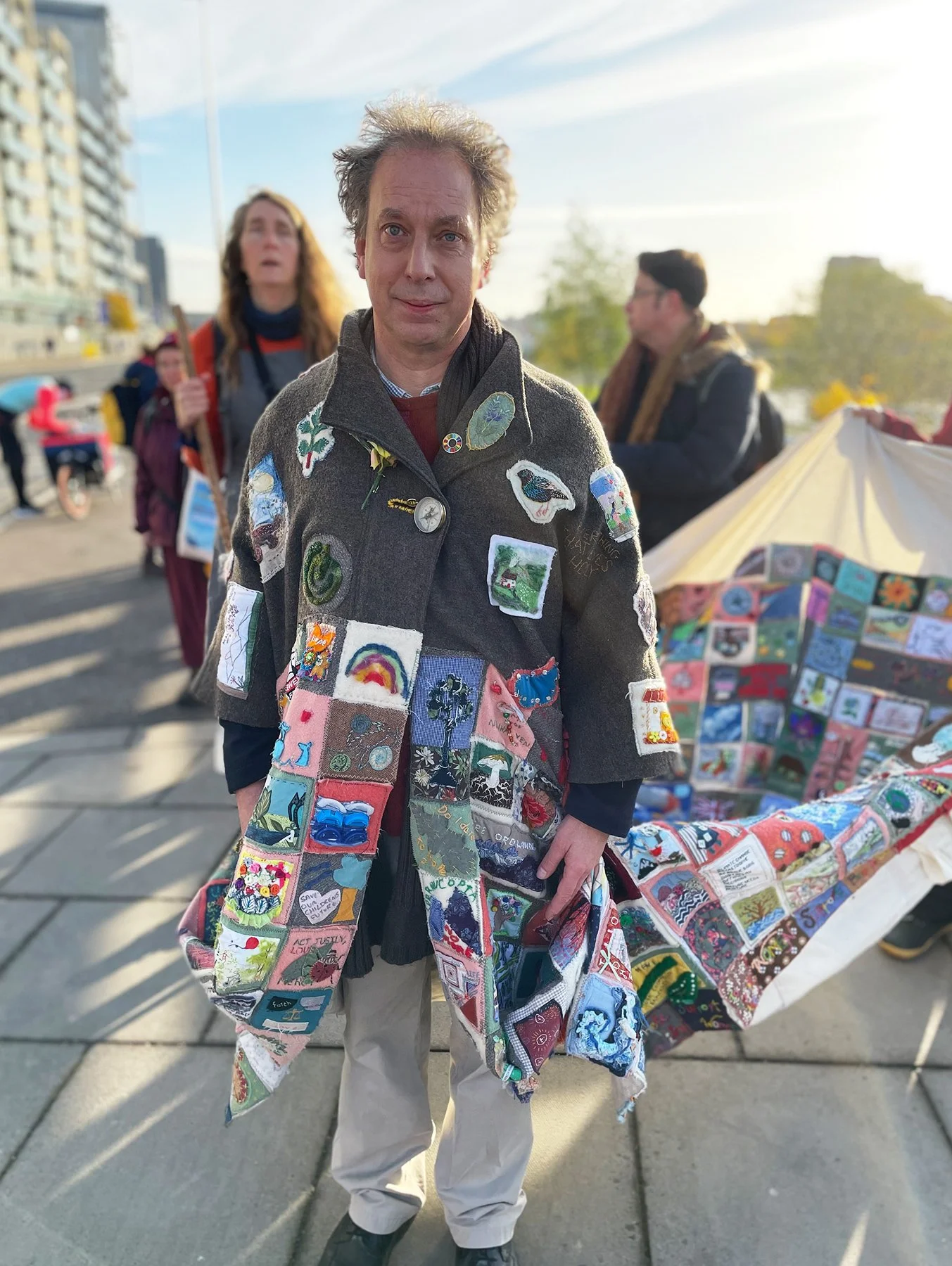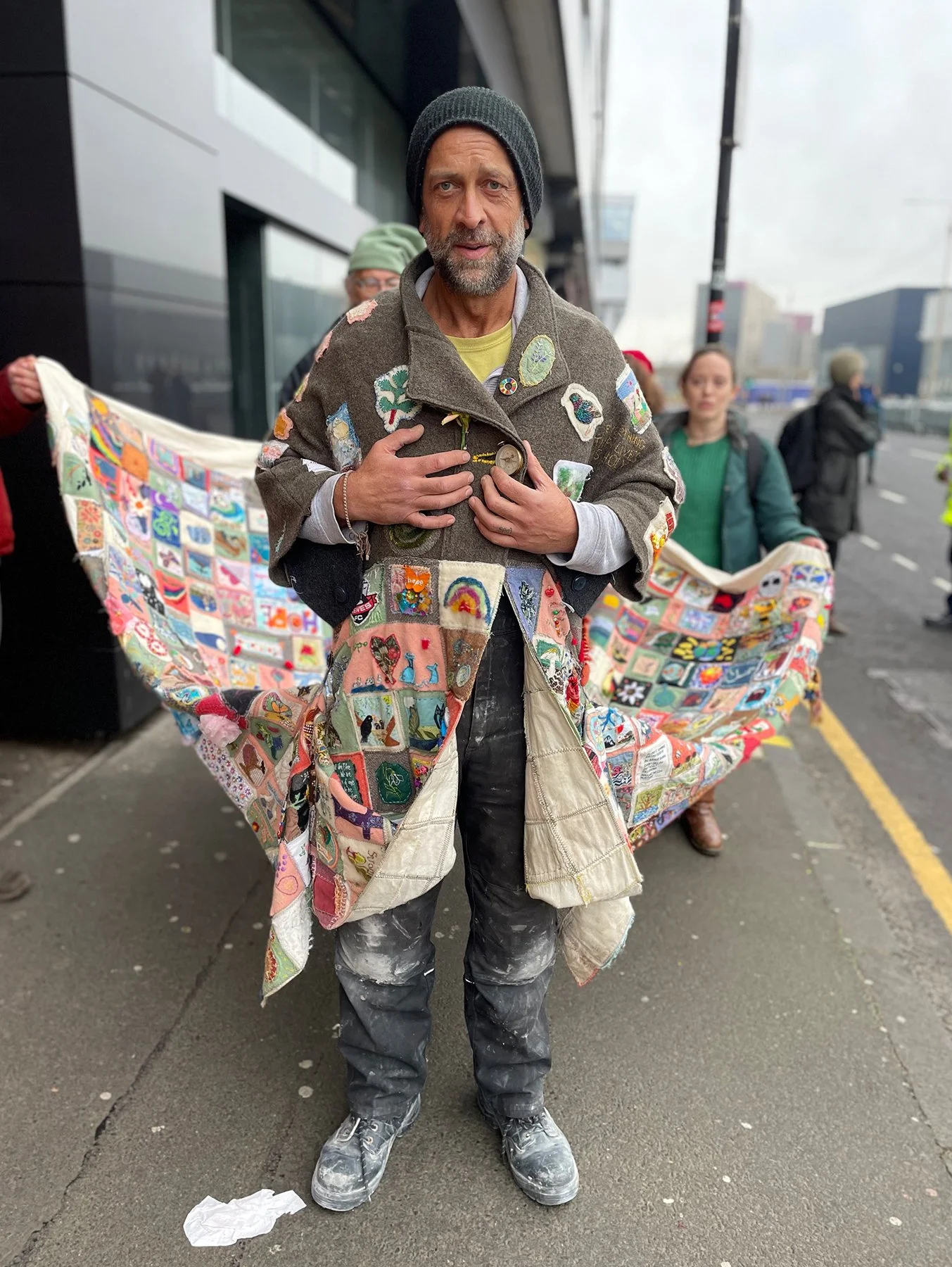 Pilgrims who wore the coat, carried stitched griefs, remembrances, prayers and hopes connected to their local landscapes and stories of migration, to the gathering of world decision makers at COP26 in Glasgow.